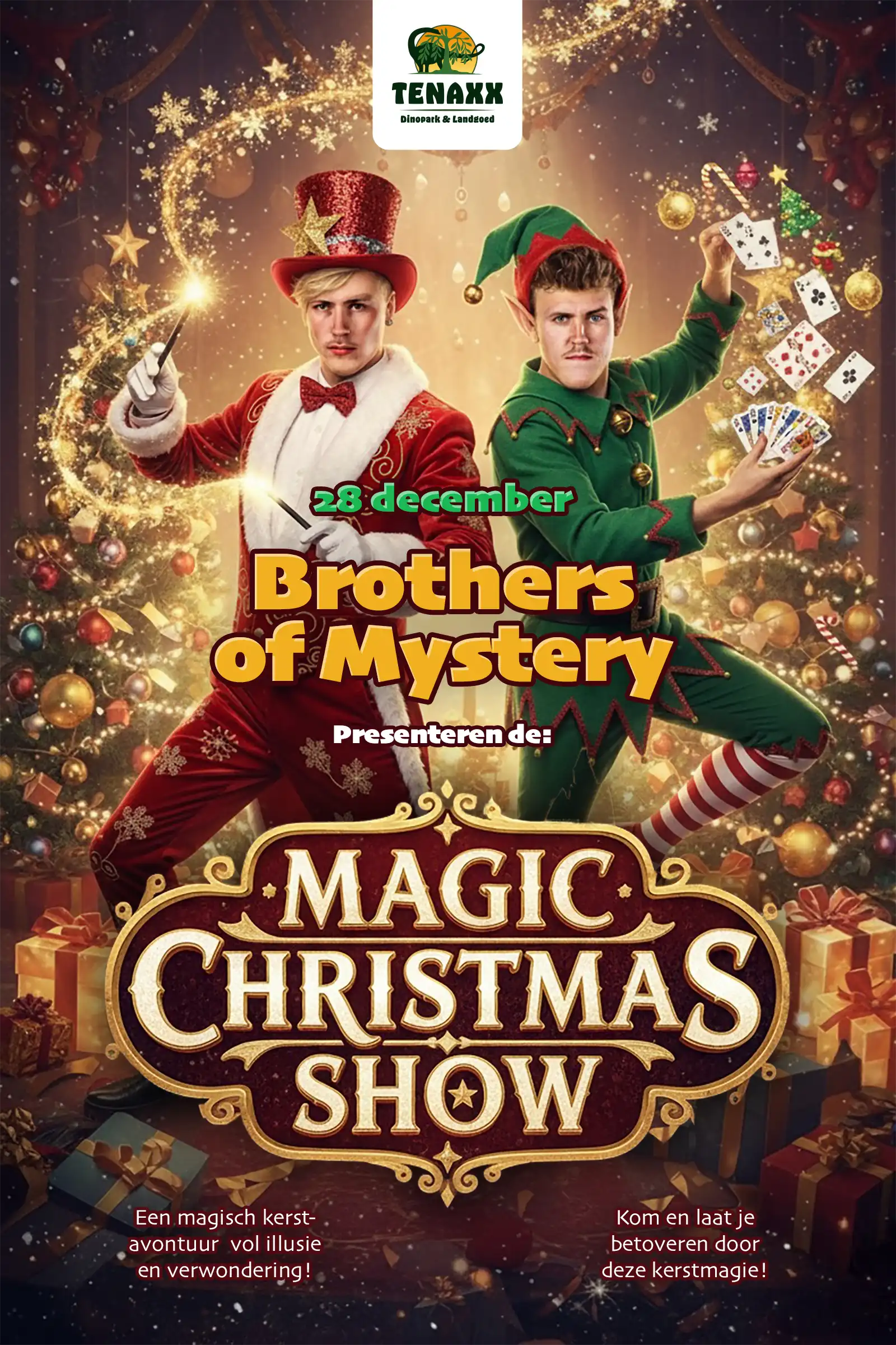 Om 12:00 Uhr du kannst das Extra genießen Magische Weihnachtsshow des Brüder des Mysteriums. In einem warmes, überdachtes Zelt nehmen sie dich auf Der magische Weihnachtsstern: eine fröhliche und spannende Weihnachtsgeschichte voller Humor, spektakulärer Illusionen und einem herzerwärmenden Finale voller Schnee und Weihnachtsstimmung.