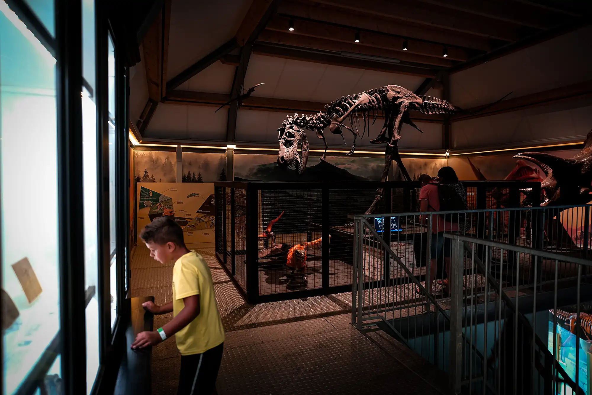 Je avontuur begint bij de oprit, geflankeerd door indrukwekkende, verlichte Sequoiadendrons – levende fossielen uit het Krijt, de tijd van de dinosauriërs. Deze magische bomen wijzen je de weg naar het museum, waar levensechte skeletten en fossielen van iconische dino’s te bewonderen zijn. Sommige van deze reusachtige dieren hebben zelfs in Nederland geleefd of gezwommen.